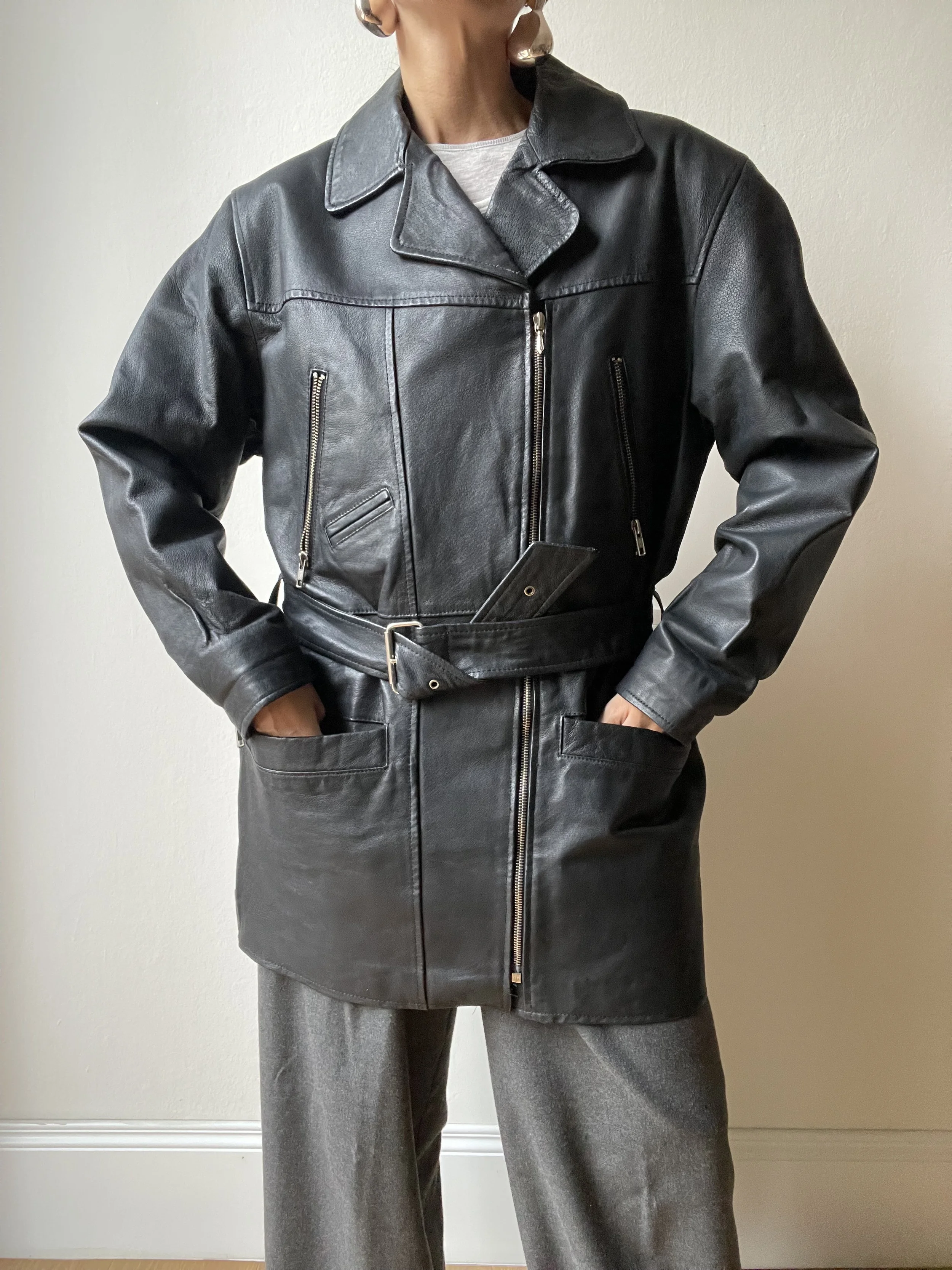 Blazer vintage in pelle crema. Modello monopetto con abbottonatura frontale e due tasche laterali + taschino interno con zip. Condizioni ottime. Taglia 48. Qui indossato da una 40.